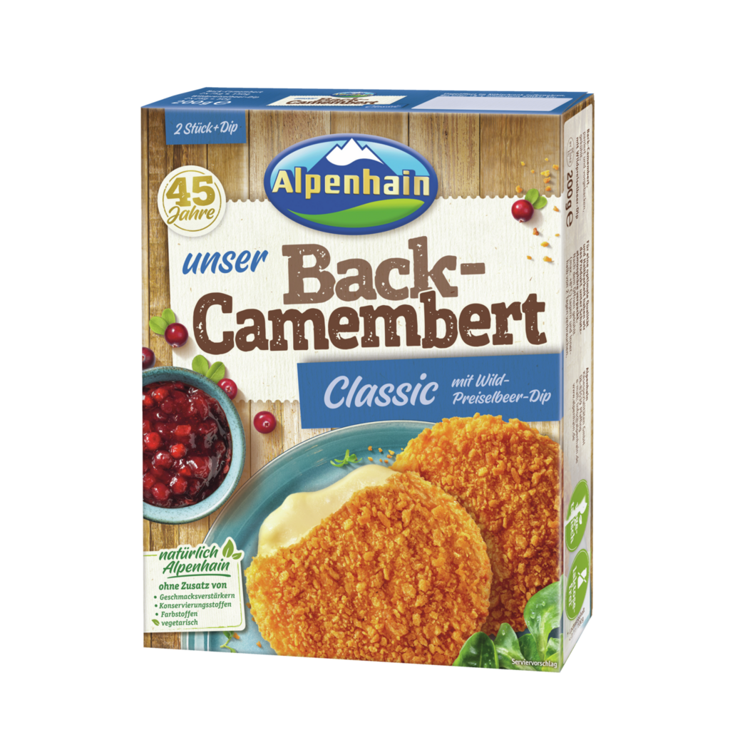 Innen fein-rahmiger Camembert aus frischer Alpenmilch, außen knusprige Panade. Der Alpenhain Back-Camembert Classic lässt sich unkompliziert im Backofen, in der Pfanne oder der Fritteuse zubereiten. Mit dem fruchtigen Wildpreiselbeer-Dip wird das Geschmackserlebnis perfekt.