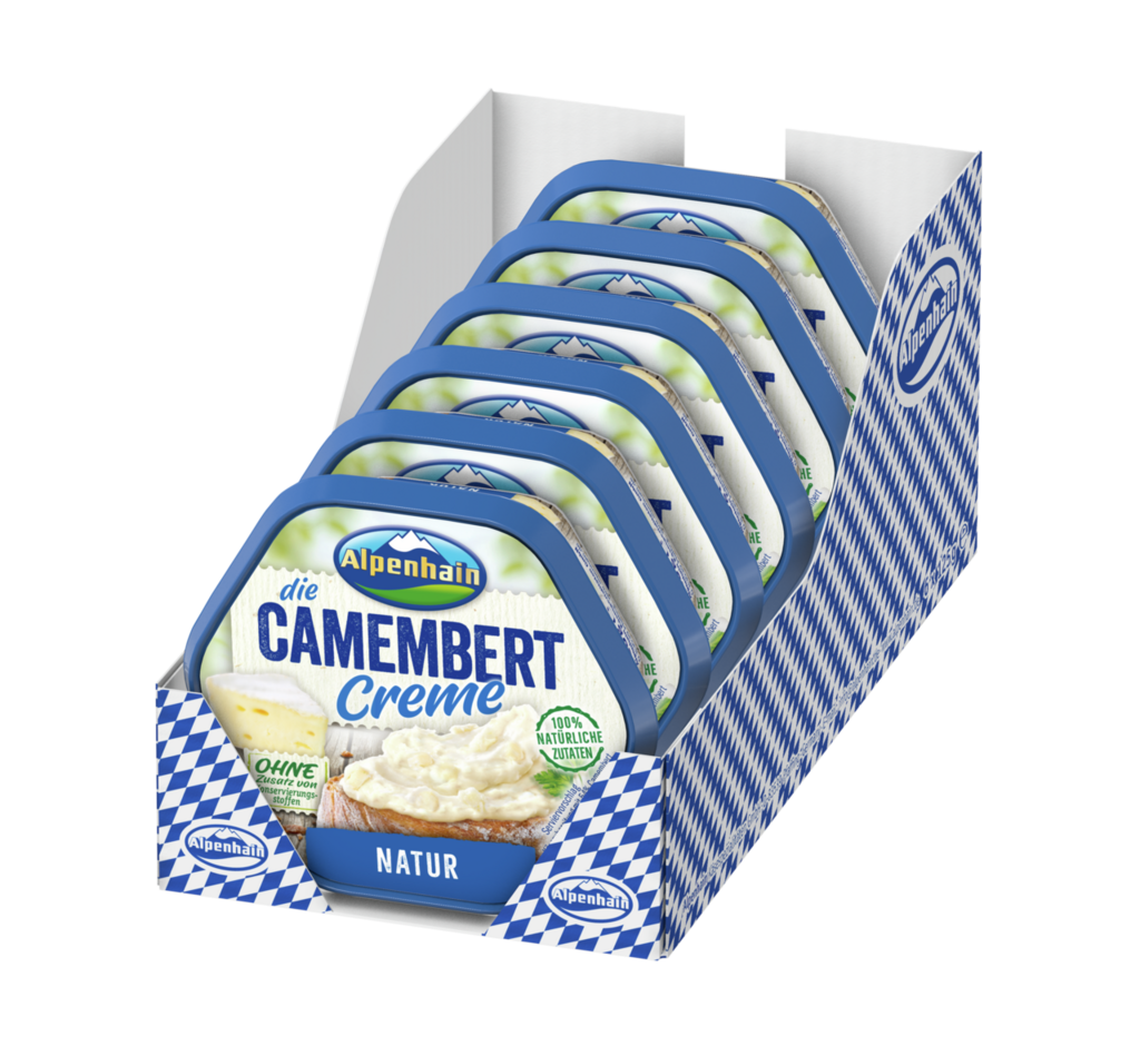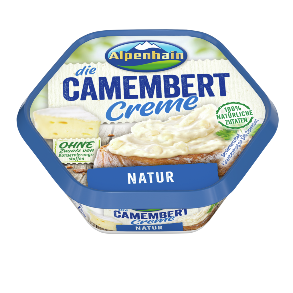 Der erste Camembert zum Streichen mit feinen Camembert-Stückchen aus frischer Alpenmilch. Die Alpenhain Camembert Creme überzeugt durch den cremigen, unverfälschten Camembert-Geschmack und die vielfältigen Anwendungsmöglichkeiten: pur, als klassischer Brotaufstrich, süß oder würzig und zum Verfeinern von Soßen und warmen Gerichten