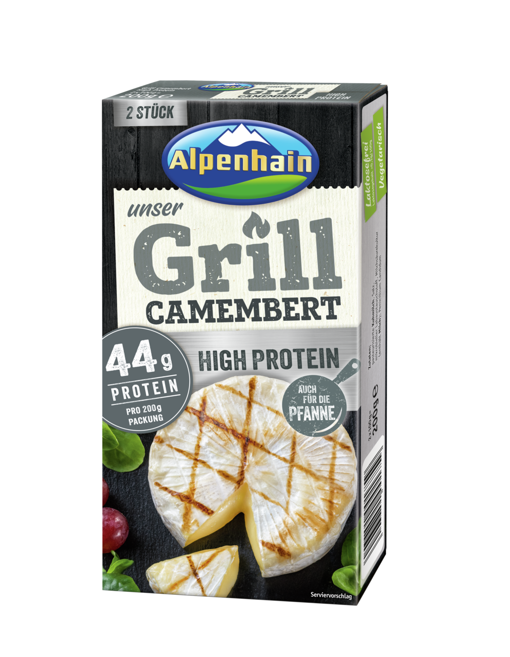 Grill Camembert mit hohem Proteinanteil, unpaniert. Der Alpenhain Grill Camembert High Protein aus frischer Alpenmilch ist unpaniert und sowohl für den Grill als auch für die Pfanne geeignet. Mit 44 g Protein pro Packung ist er ideal als vegetarische Alternative für Fitness- und Gesundheitsbewusste.