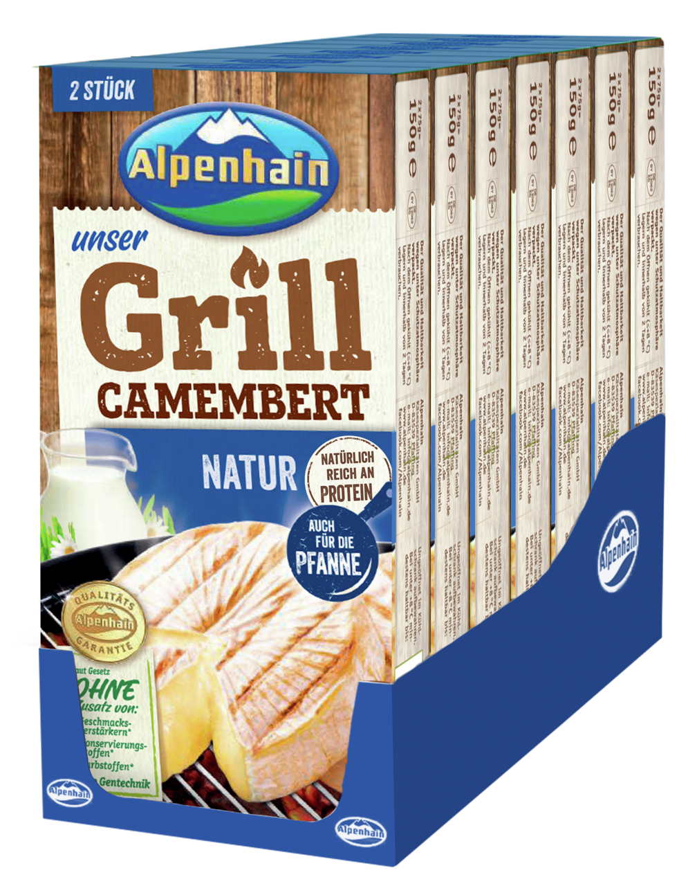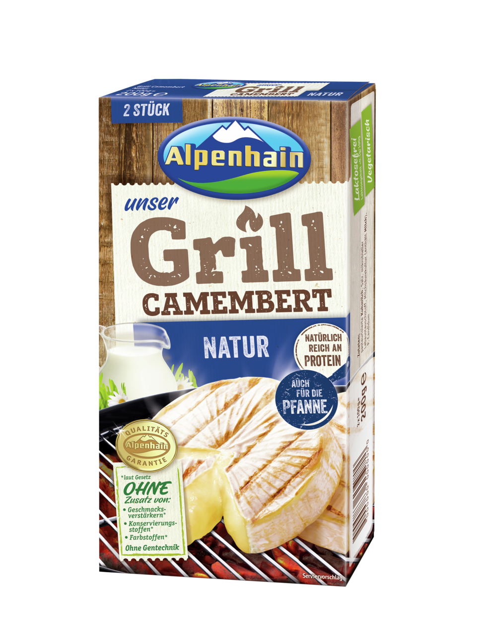 Cremig-purer Grill Camembert, unpaniert. Der Alpenhain Grill Camembert aus frischer Alpenmilch ist unpaniert und sowohl für den Grill als auch für die Pfanne geeignet. Die vegetarische Alternative zum Grillfleisch und zur Grillwurst. Laut Gesetz ohne Zusatz von Geschmacksverstärkern, Konservierungs- und Farbstoffen. Vegetarisch, laktosefrei sowie ohne Gentechnik. Natürlich reich an Protein.