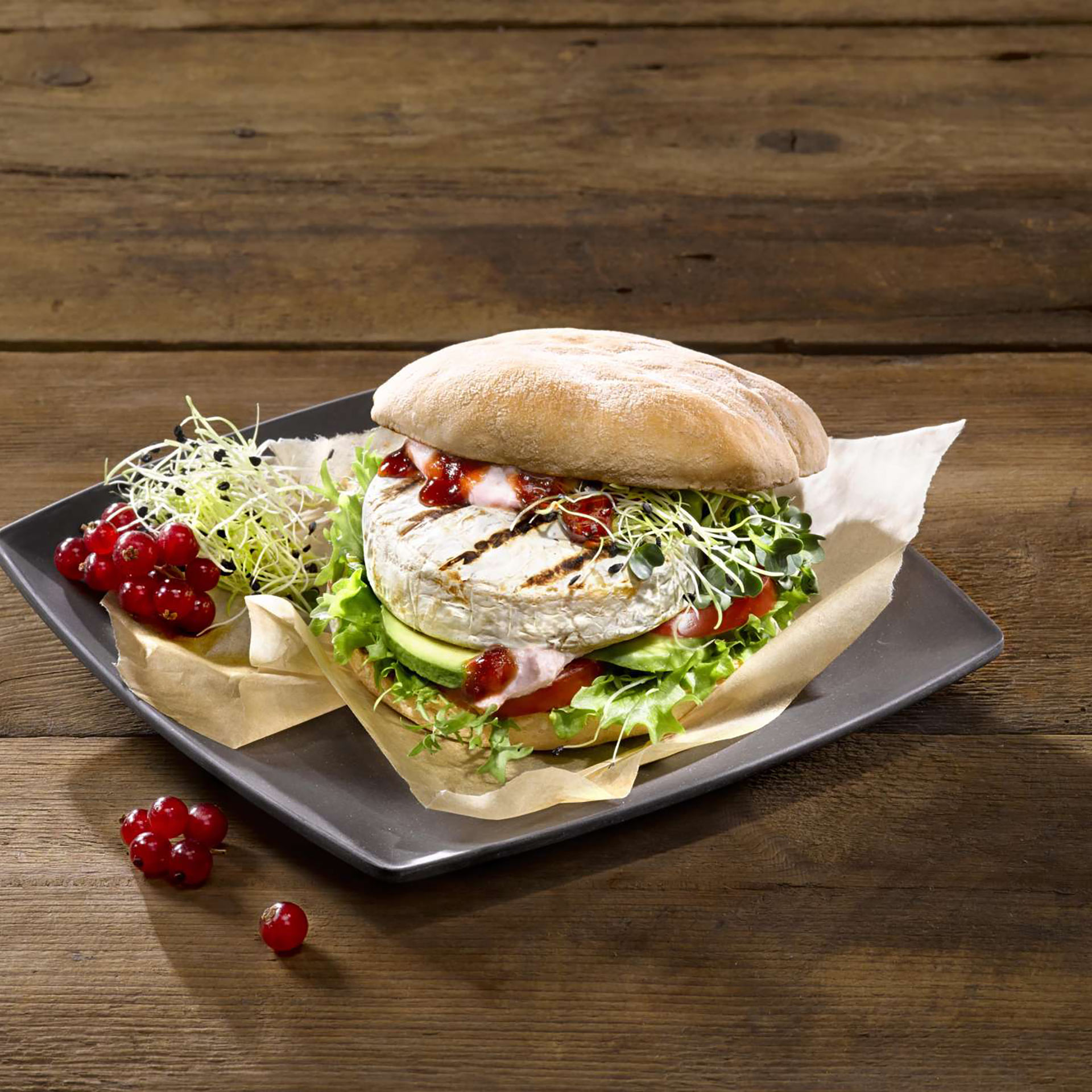 - Brötchen-Boden mit dem Salat, den Tomatenscheiben und der Avocado belegen. Darauf den Alpenhain Grill Camembert geben und mit dem Rest der Cumberland-Sauce bestreichen. Abschließend mit der Kresse toppen und mit dem Brötchen-Deckel bedecken.