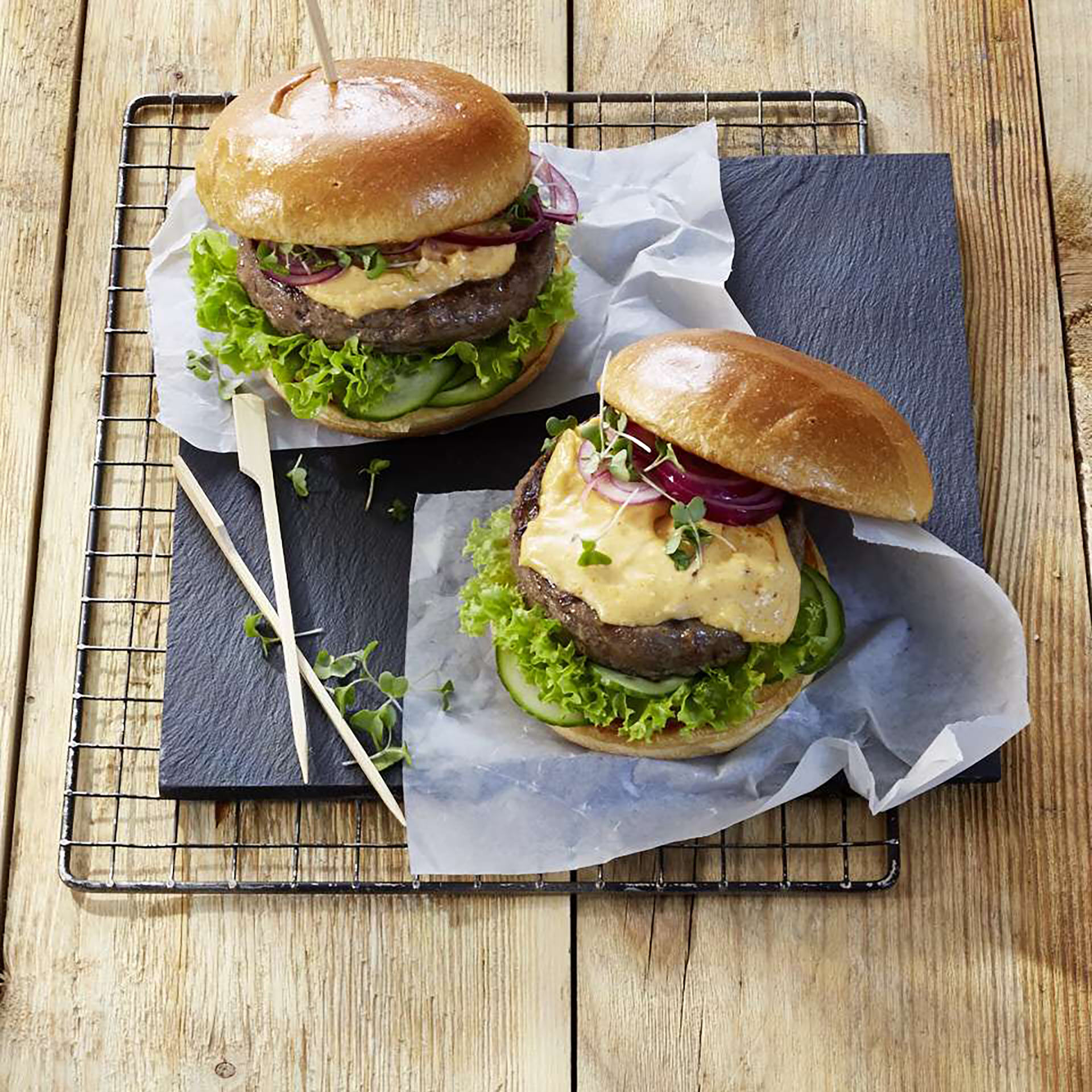 - Die Patties mit Öl von beiden Seiten ca. 2-3 Minuten braten, zum Schluss den Alpenhain Original Obazda Klassisch darauf verteilen.