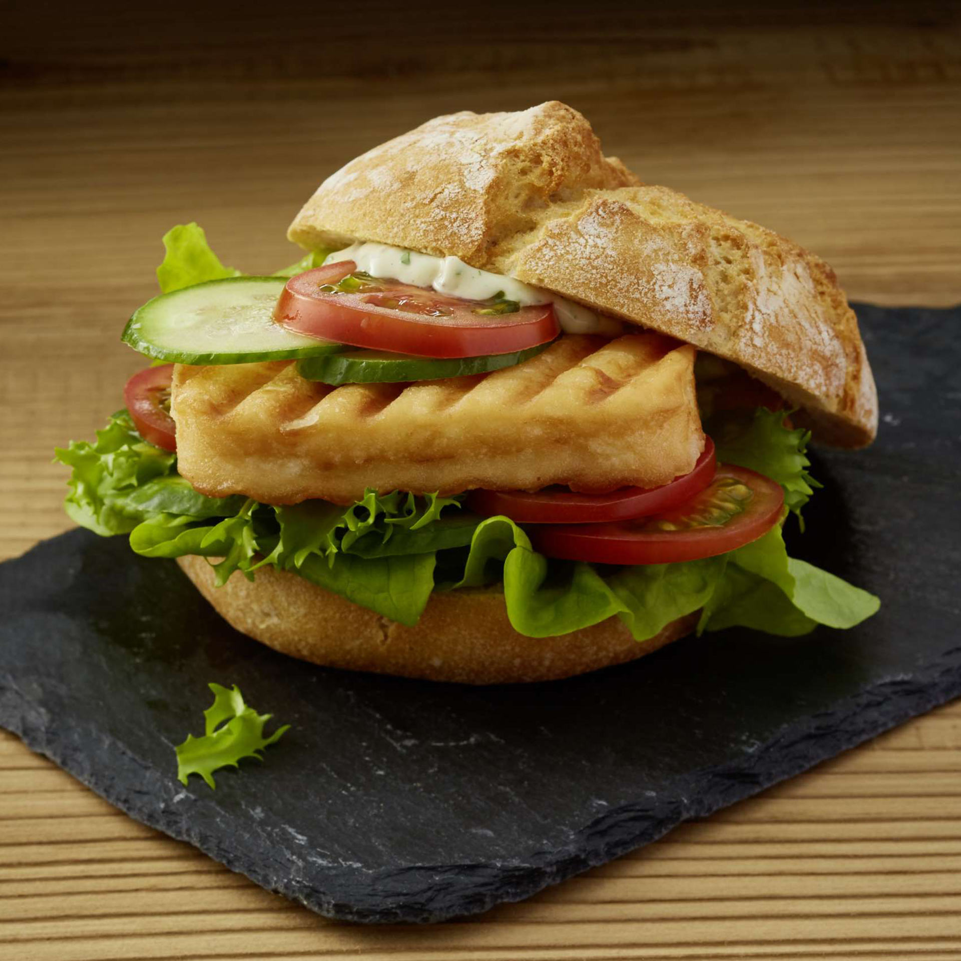 - Untere Semmel-Hälfte mit Salatblättern, Tomaten- und Gurkenscheiben und Alpenhain Grill Käsegenuss belegen. Darauf die Remoulade oder Mayonnaise geben und mit oberer Semmel-Hälfte bedecken.
