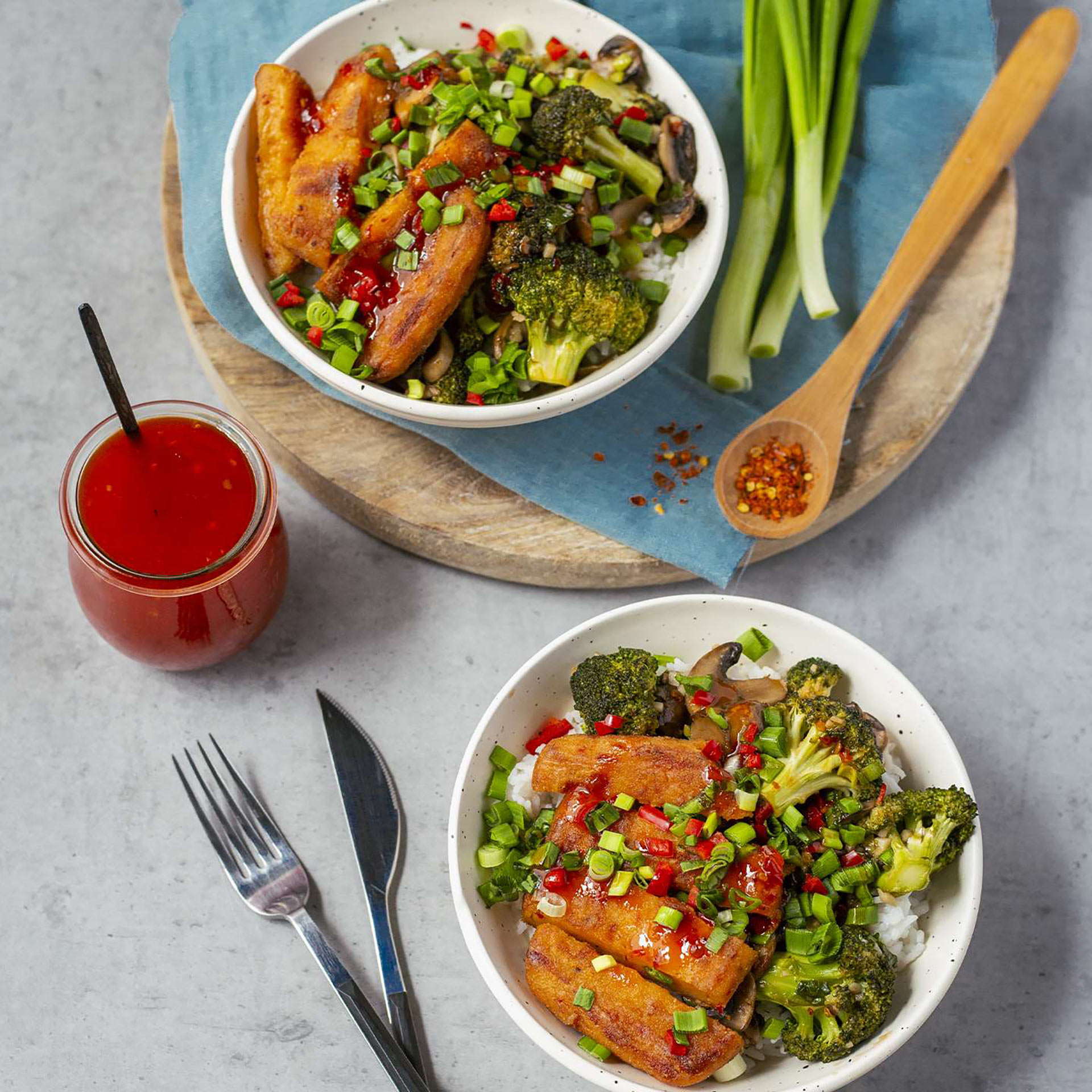 - Alpenhain Grill Käsegenuss Natur auf die Schüsseln verteilen, die restliche Frühlingszwiebeln und die rote Chili darüber streuen und mit süßer Chilisauce beträufeln.