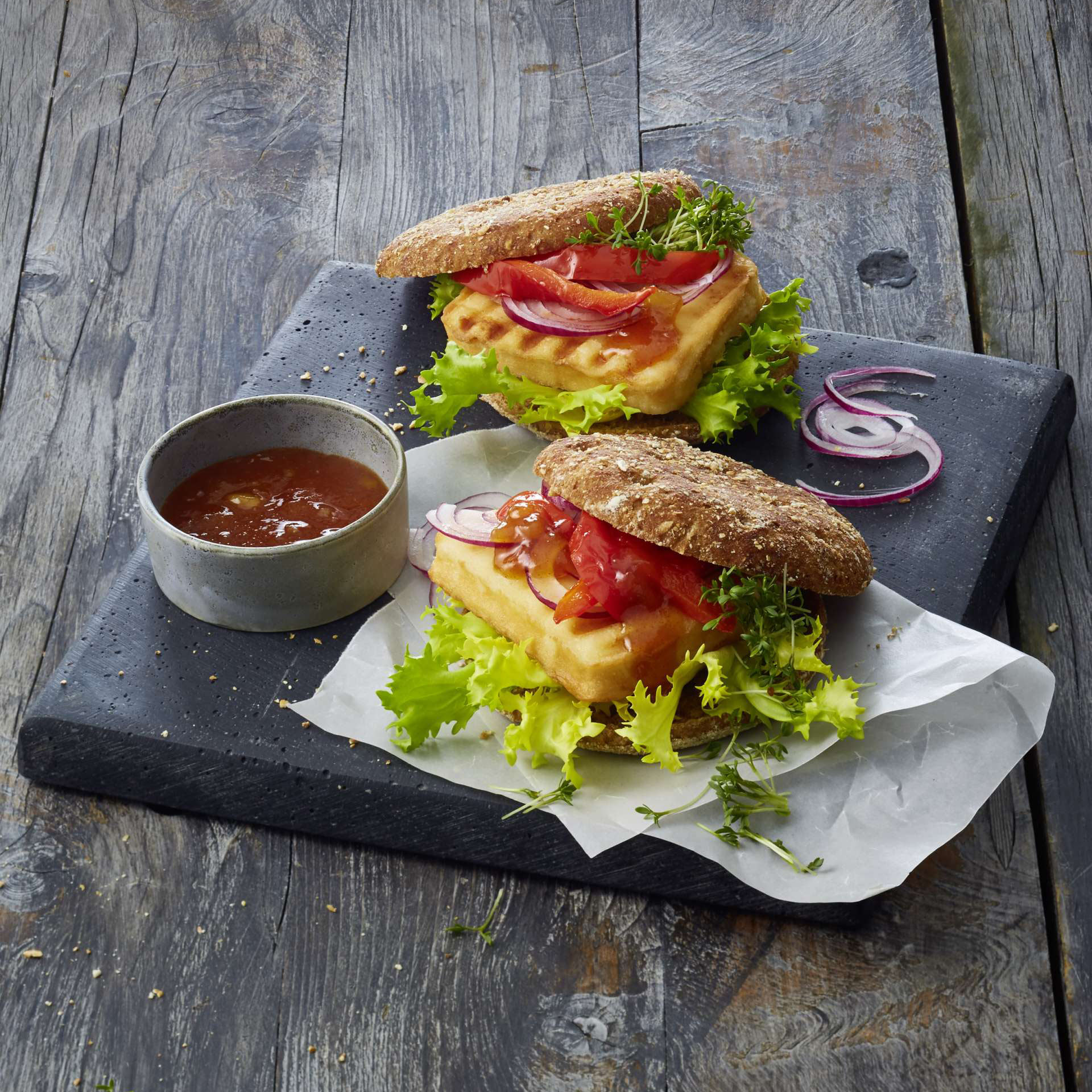 - Den Bun-Boden mit Salatblättern, Alpenhain Grill Käsegenuss, Zwiebelringen und karamellisierten Paprikastreifen belegen. Darauf noch mal Chutney und die Kresse geben und schließlich mit dem Bun-Deckel bedecken.