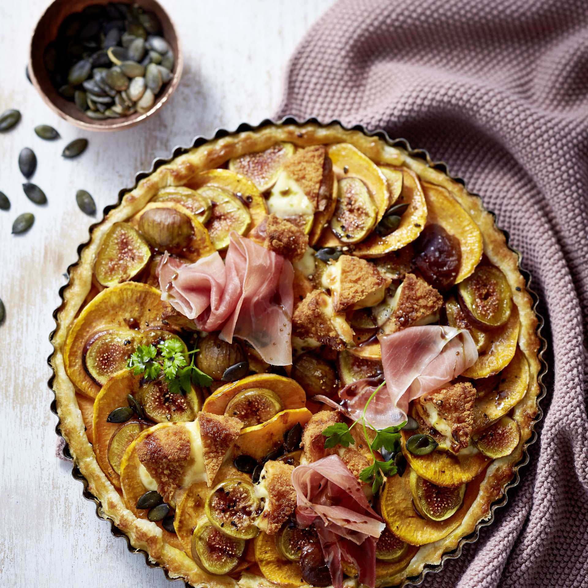- Tarte aus dem Ofen nehmen und mit dem Kürbiskernöl beträufeln. Serrano-Schinken locker darauf verteilen. Kürbiskerne darauf verteilen. Tarte anrichten. Mit Kerbelblättern garnieren.