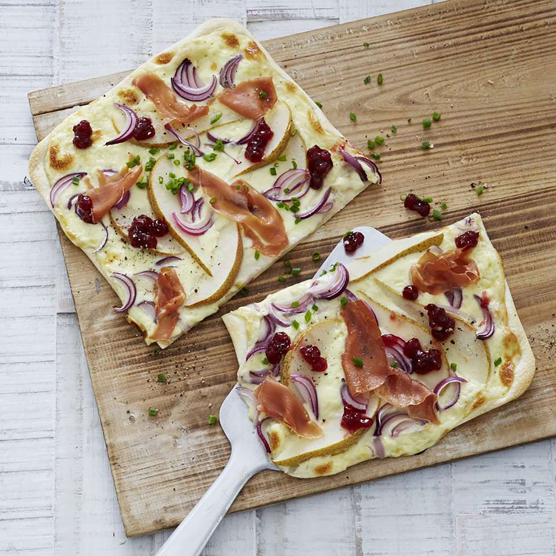 - Mit grobem Pfeffer bestreuen und bei 225° C ca. 10 Minuten backen. Aus dem Ofen nehmen und mit den Preiselbeeren und den Schnittlauchröllchen bestreuen.