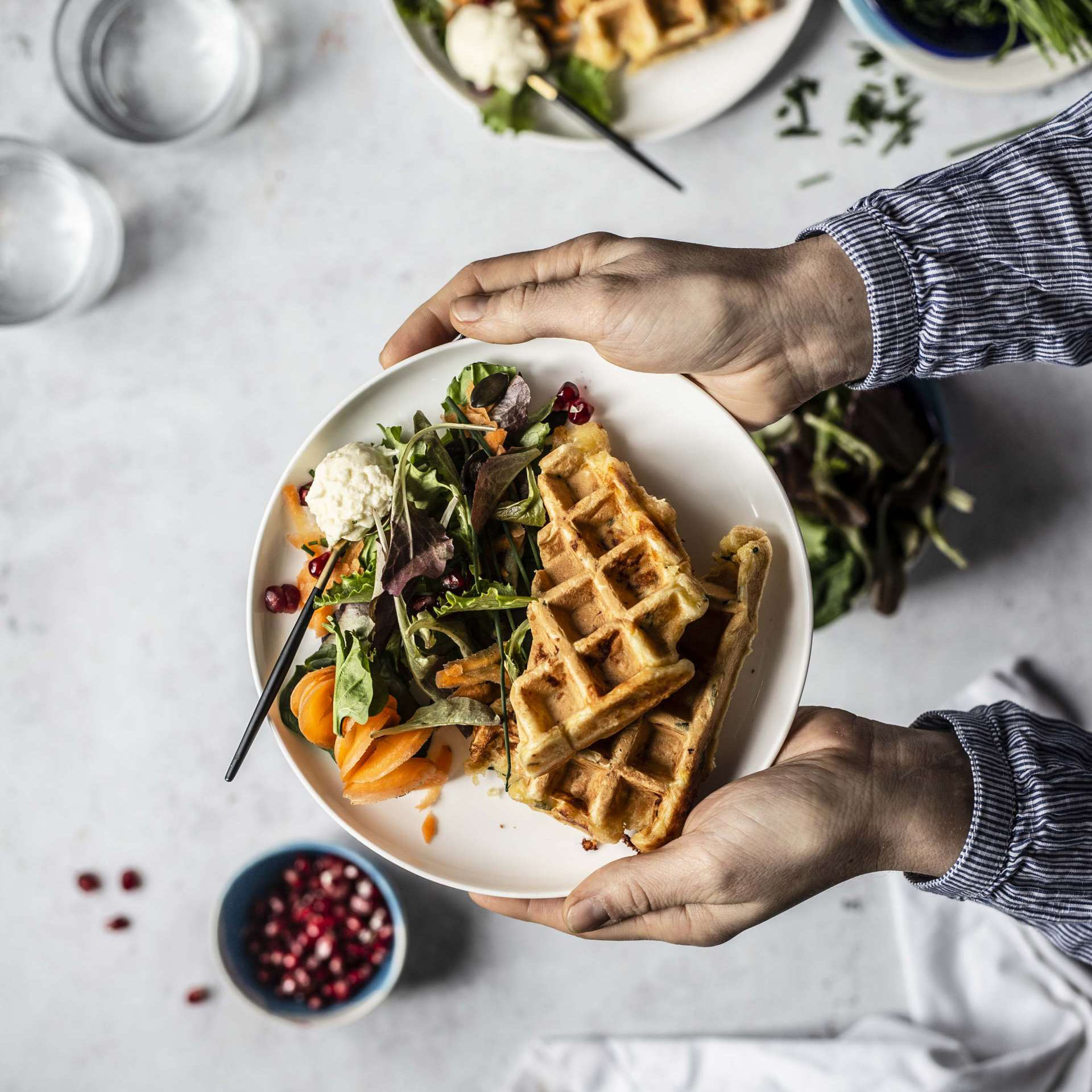 - Granatapfelkerne aus der Schale lösen. Nun nach Belieben Pflücksalat, Karottenspiralen bzw. -raspel, Kürbis- und/oder Granatapfelkerne sowie den restlichen Schnittlauch auf den Waffeln anrichten. Zusätzlich ganz nach Lust und Laune Alpenhain Camembert Creme Natur dazu reichen.