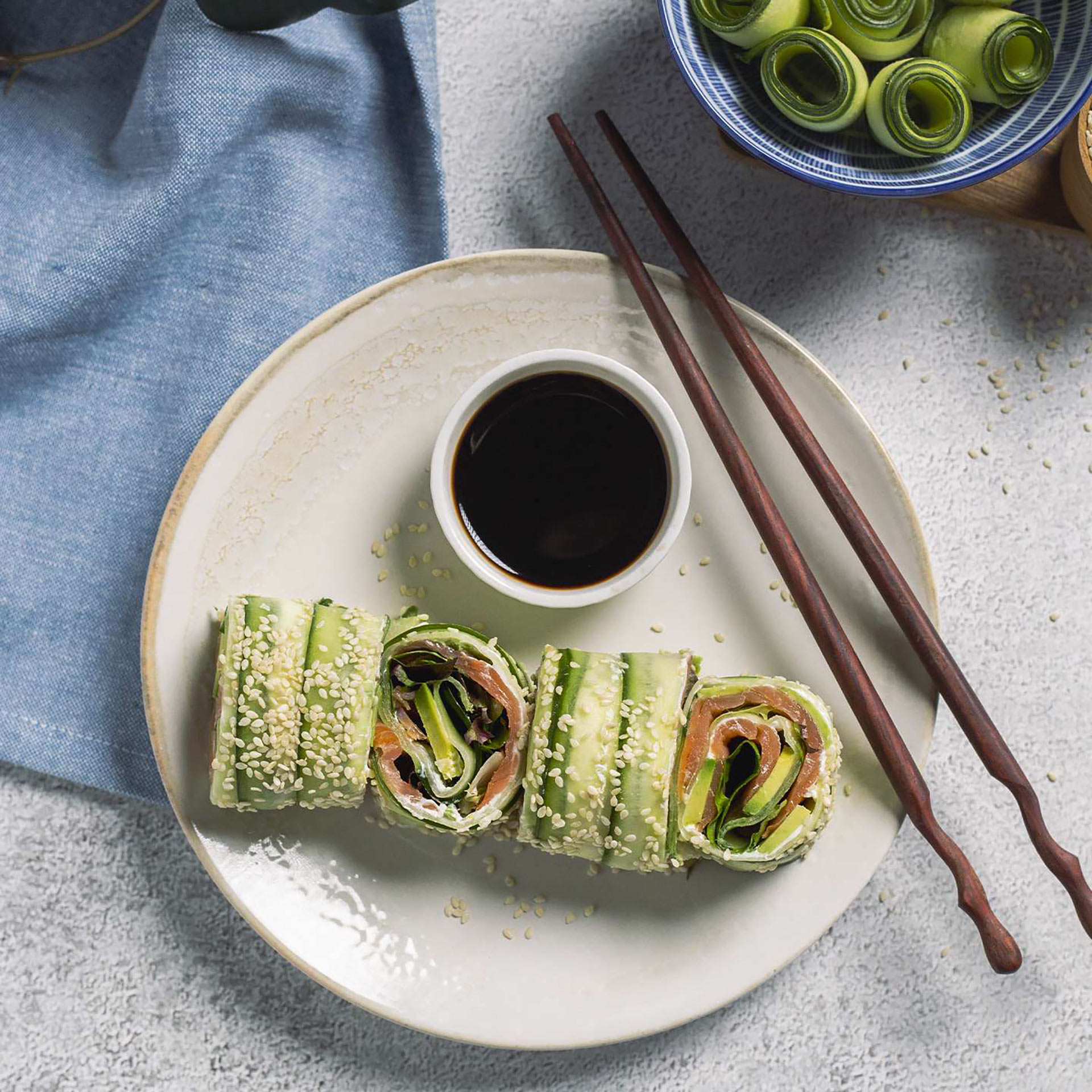 - Zum Schluss die Gurken-Sushi-Rolls mit Sojasauce anrichten und servieren.