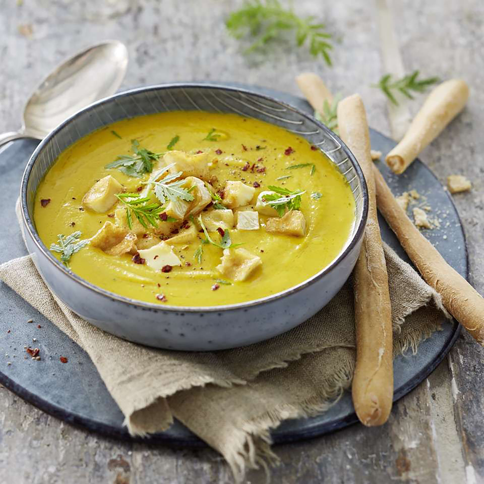 - Auf Suppenschalen verteilen, mit gebratenen Alpenhain Grill Käsegenuss-Würfeln bestreuen und mit Chiliflocken sowie Korianderblättchen oder Tagetes garnieren.