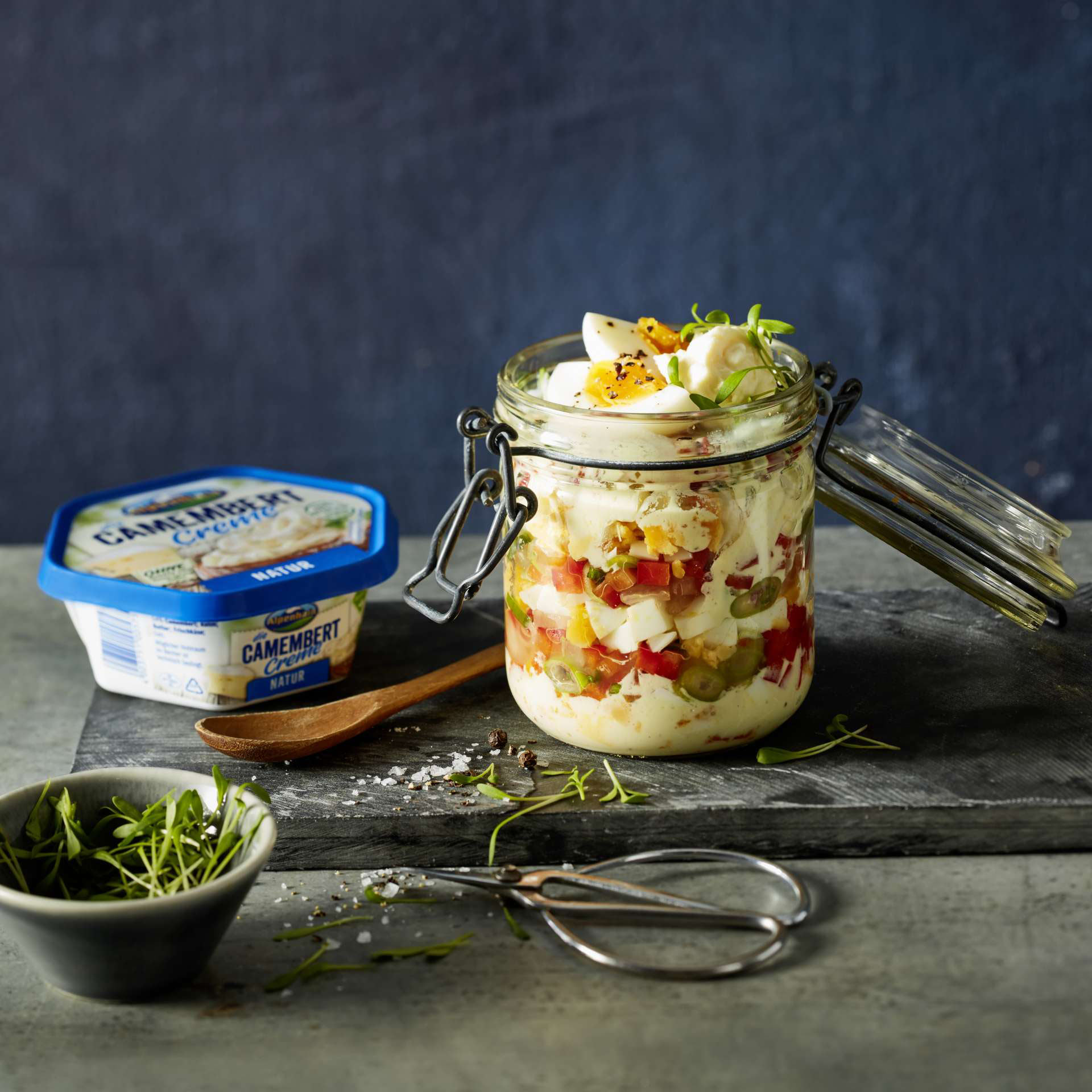- Je etwas Dressing, Gemüse-Mix und Eierwürfel abwechselnd in 2 Schichten in 4 Gläser (à ca. 450 ml) einschichten, dabei mit Dressing abschließen. Kresse vom Beet schneiden. Salat mit restlichen Eiern, übriger Alpenhain Camembert Creme, Kresse und etwas Pfeffer garnieren.