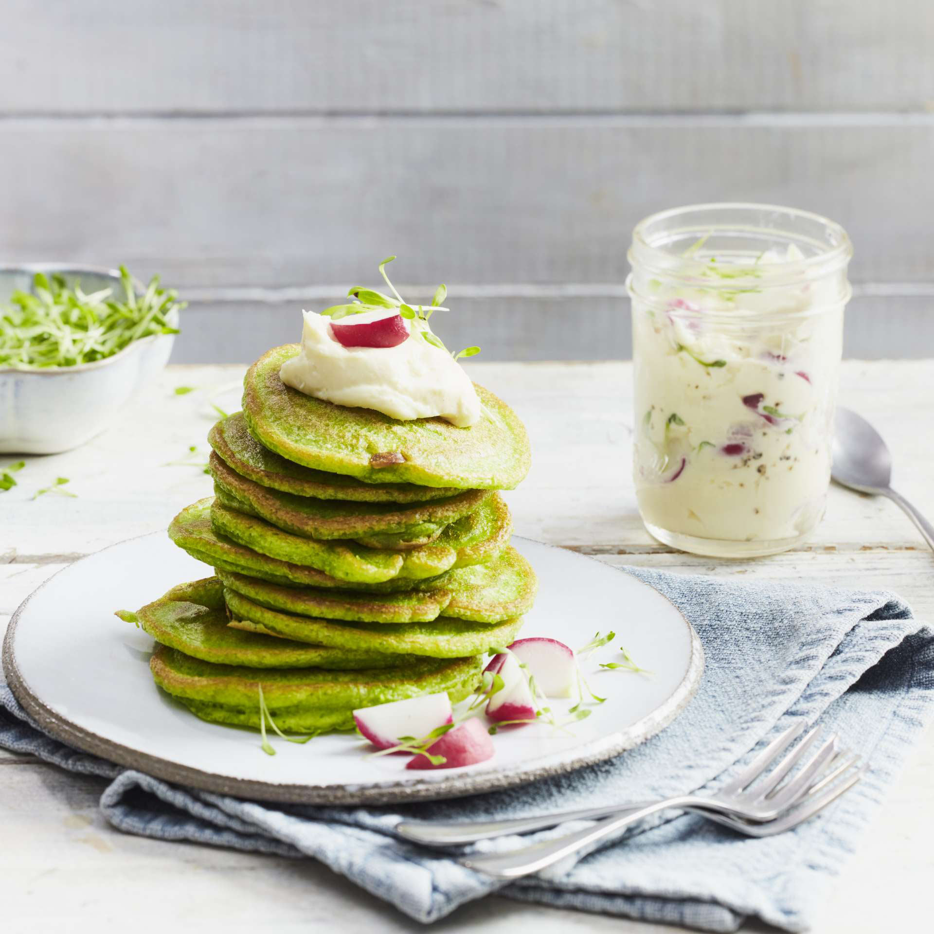 - Öl in 6 Portionen in einer weiten beschichteten Pfanne erhitzen. 4 Teigkleckse in die Pfanne geben und handtellergroße Pancakes goldbraun ausbacken. Herausnehmen. Aus Rest Öl und Teig 20 weitere Pancakes ausbacken. Jeweils 6 fertige Pancakes zum „Tower“ stapeln. Einen Klecks Dip auf den oberen Pancake geben. Mit Rest Kresse und Radieschenspalten garnieren. Rest Dip dazu reichen.