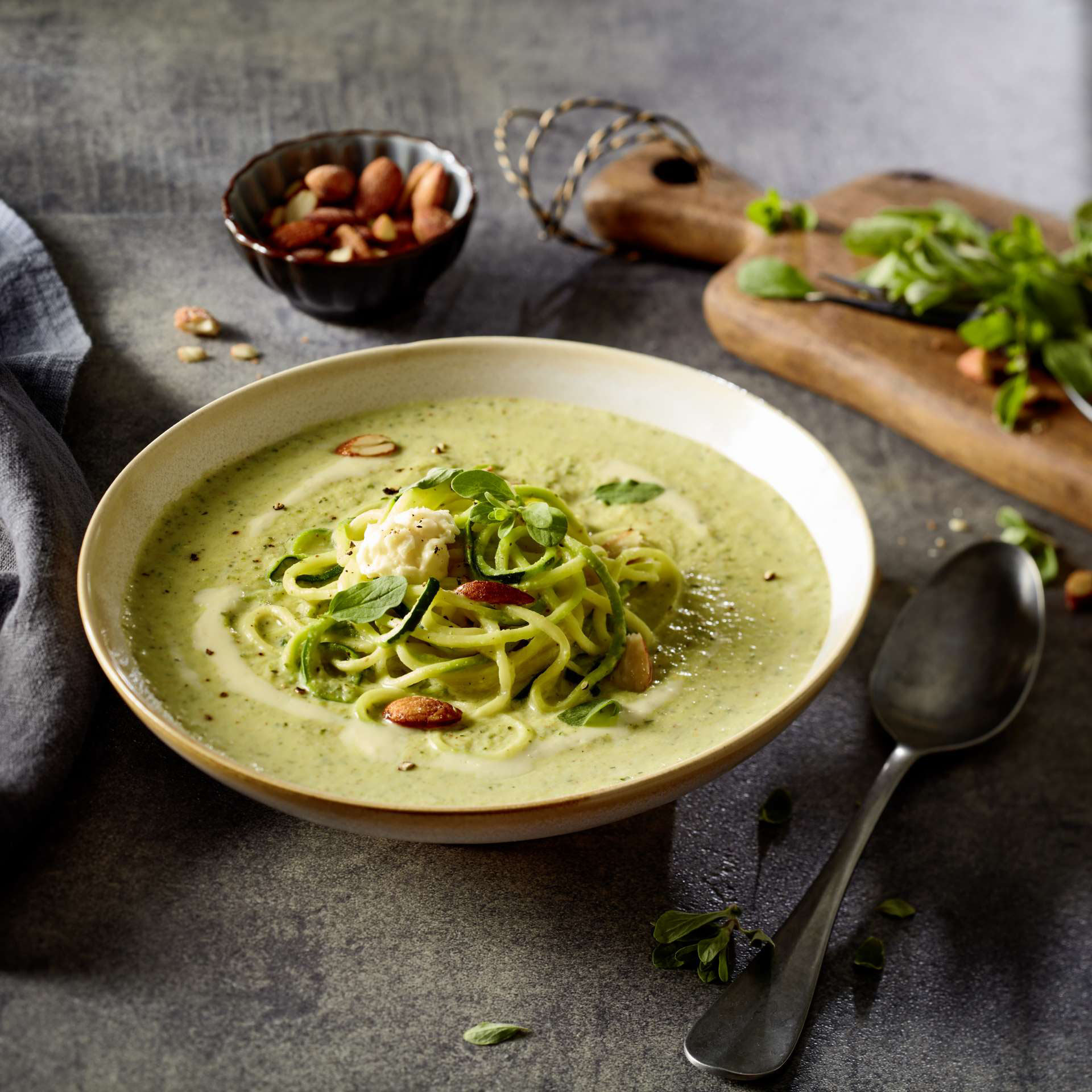 - Zucchini-Süppchen anrichten, Zucchini-Spaghetti mittig als „Nest“ daraufsetzen. Sahne-Mix darum verteilen. Mit 50 g Alpenhain Camembert Creme als Klecks und Majoran garnieren, mit Honig-Mandeln bestreuen.