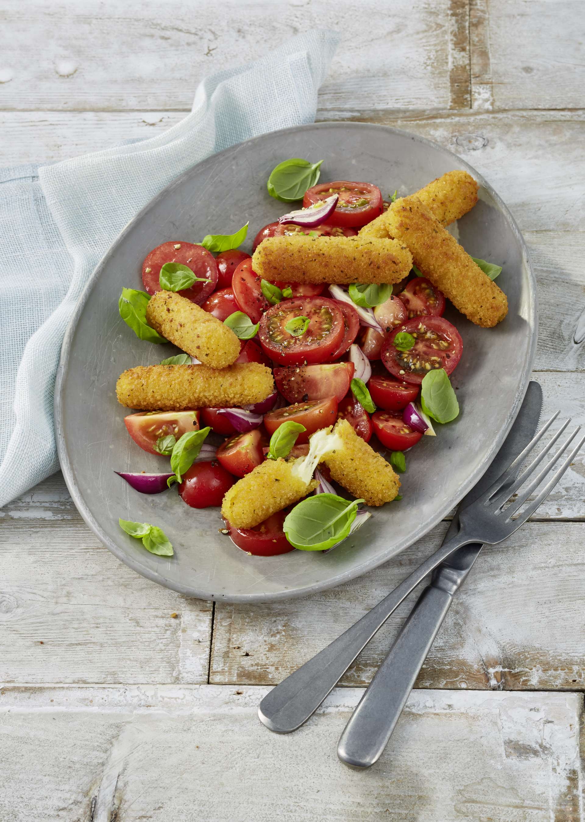 - Alpenhain Back-Mozzarella Sticks nach Packungsanweisung zubereiteten und auf dem Salat anrichten.