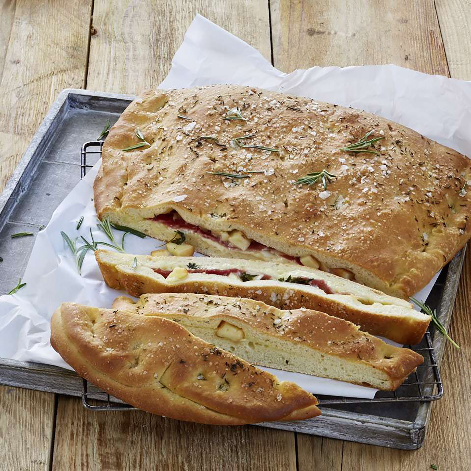 - Die zweite Teigplatte darauf platzieren und die Ränder fest andrücken. Mit Olivenöl bepinseln und mit grobem Salz, Pfeffer und italienischen Kräutern bestreuen.