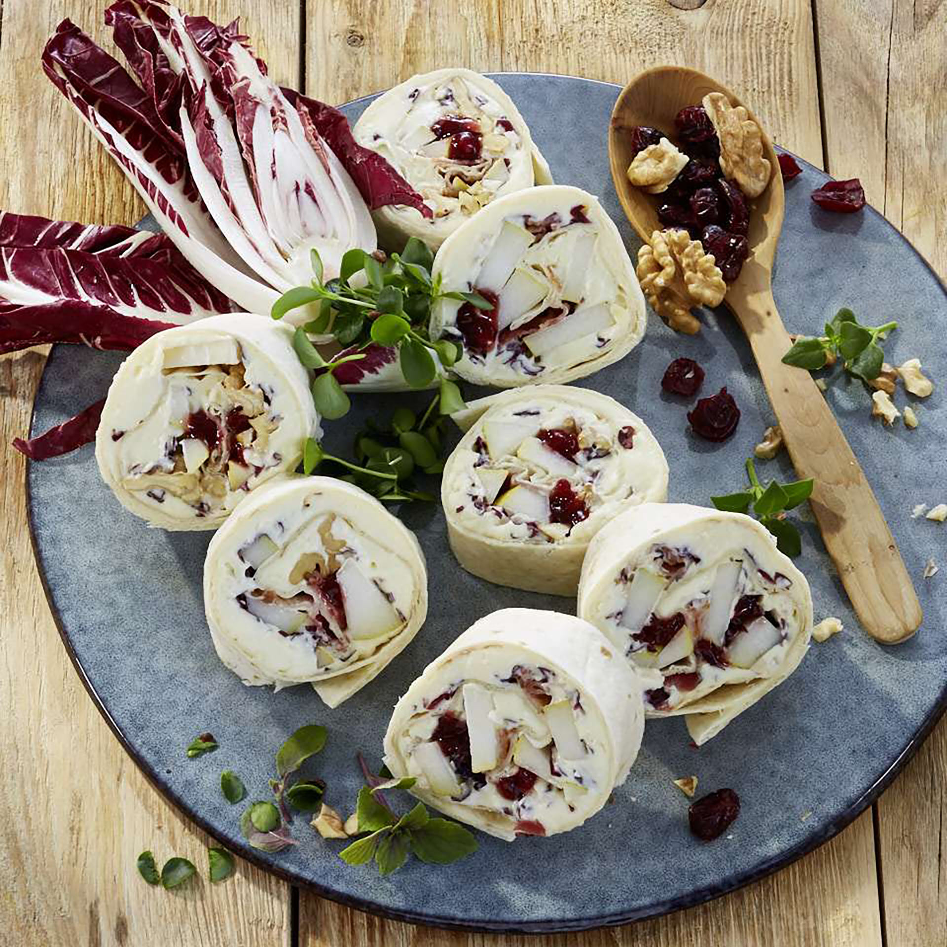 - Birnenstreifen auf den Weizentortillas quer zur Rollrichtung verteilen, Trevisano, Walnüsse und die getrockneten Cranberries darauf verteilen. Die Seiten etwas einklappen und die Wraps fest einrollen.