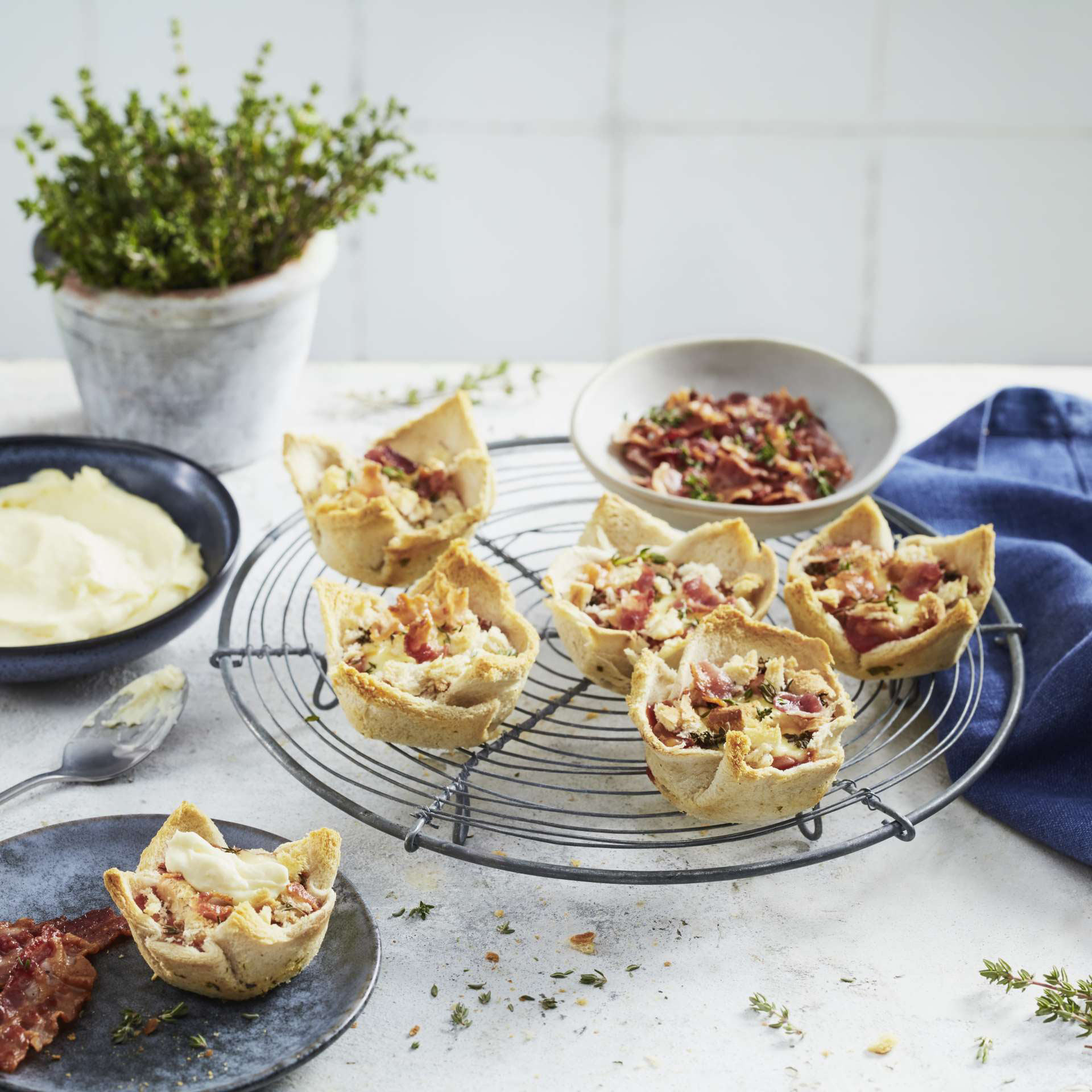 - Inzwischen Bacon in einer großen Pfanne ohne Fett knusprig auslassen. Fertigen Bacon auf Küchenpapier abtropfen lassen. Bacon grob zerbröseln und mit Rest Thymian mischen. Muffins anrichten. Mit Speck-Mix und einem Klecks Alpenhain Camembert Creme garnieren.