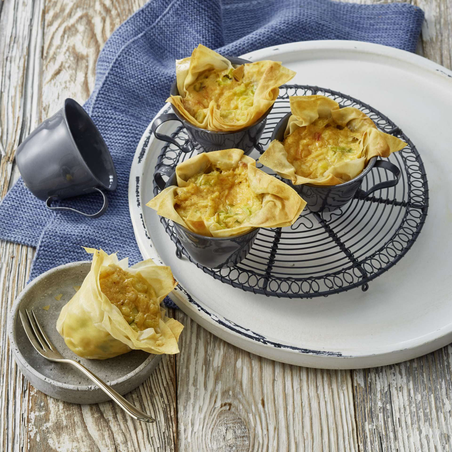 - Espressotassen ausbuttern, mit den zugeschnittenen Strudelblättern auskleiden und mit der Käsemasse füllen.