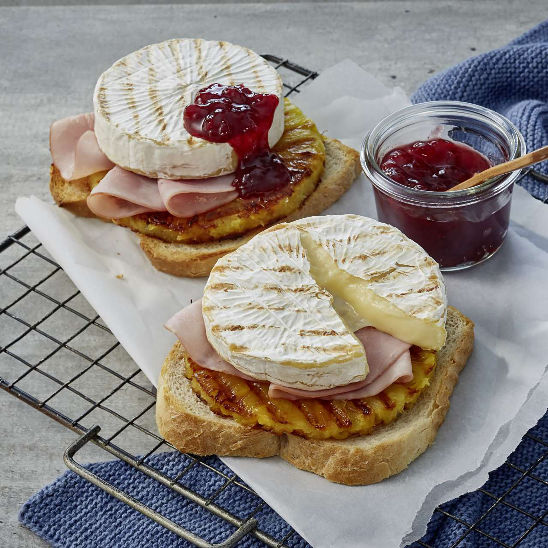 - Auf den Toast die gegrillte Ananasscheibe legen. Dann darauf 2 Scheiben Kochschinken geben. Zuletzt den fertigen Alpenhain Grill Camembert noch drauf platzieren.