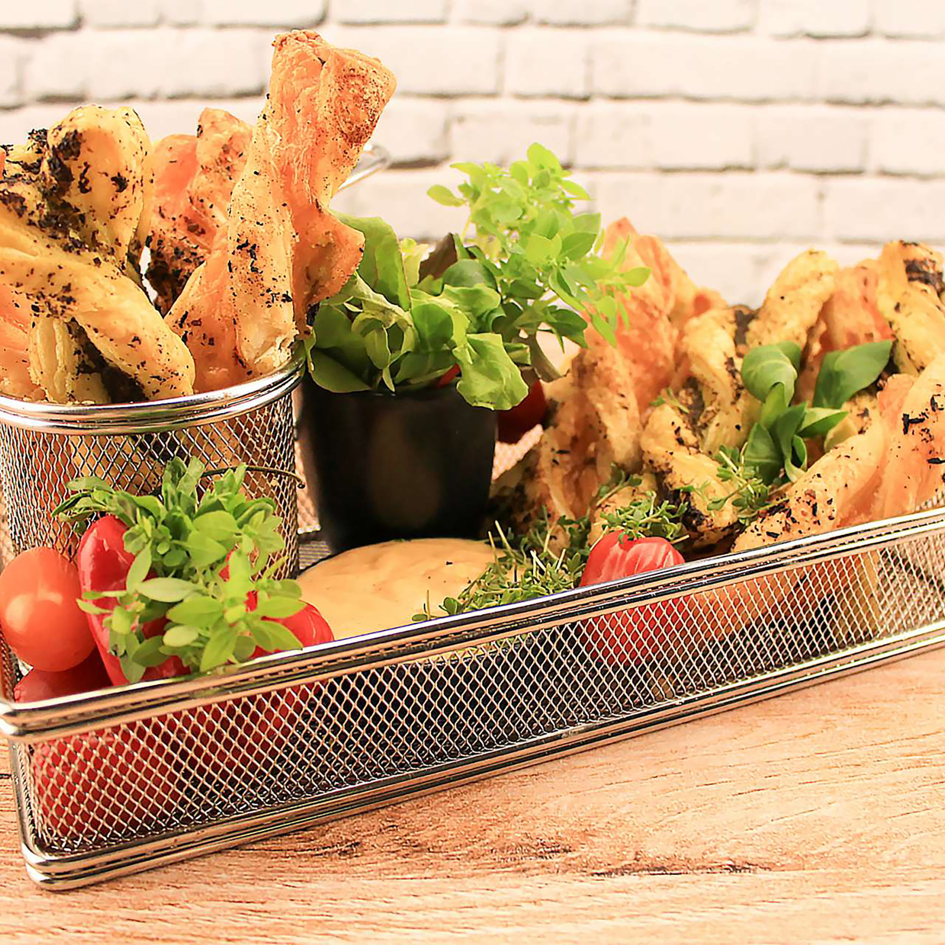 - Die fertigen Blätterteigstangen mit Salat, Kirschtomaten und Dip servieren.