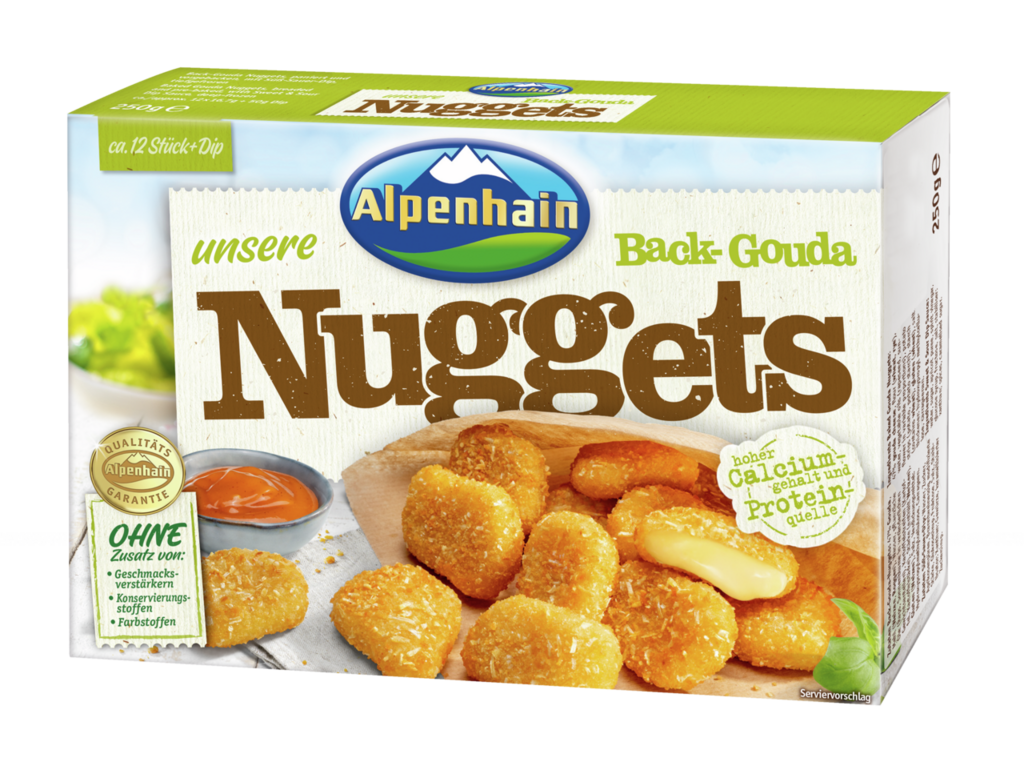 Zart-milder Gouda mit herzhaft-krosser Kartoffelstreifenpanade in Nugget-Form. Die Alpenhain Back-Gouda Nuggets sind die ideale vegetarische Alternative zu Hähnchen-Nuggets. Ob mit Süß-Sauer-Dip als Snack für zwischendurch oder als Topping auf einem frischen Salat – die Back-Gouda Nuggets sind eine natürliche Proteinquelle mit hohem Calciumgehalt.